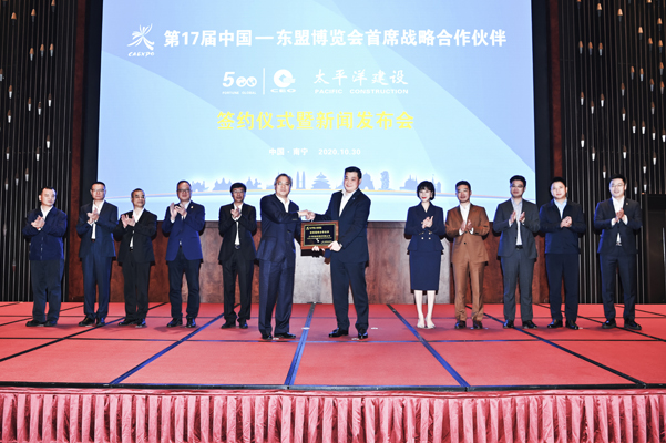 10月30日,第17届中国-东盟博览会首席战略合作伙伴签约仪式暨新闻发布会在广西南宁举行,太平洋建设连续第3年携手东博会,成为第17届东博会首席战略合作伙伴。