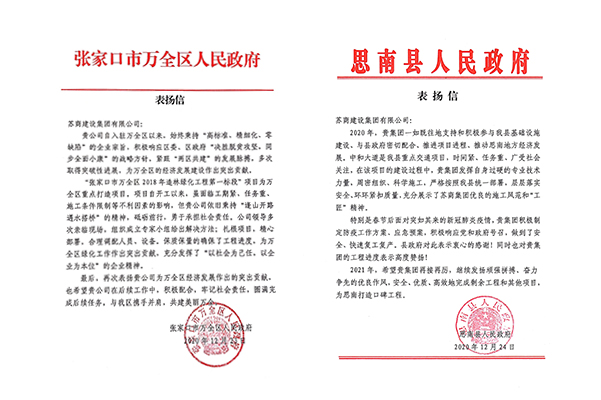 苏商建设第二十一集团收到河北省张家口市万全区政府、贵州省思南县政府的表扬信
