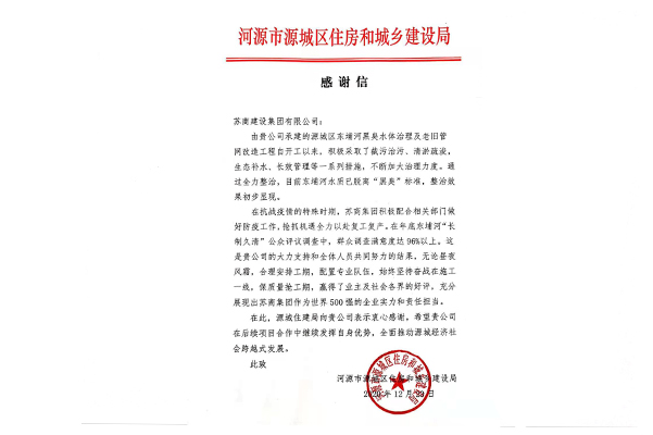 近日,苏商建设第六集团收到来自广东省河源市源城区住建局的感谢信。信中提到,自源城区项目开工以来,国产自拍 积极作为,使东埔河水质达到脱离“黑臭”标准,并在年底公众评议调查中,满意度达96%以上。希望国产自拍 在后续项目合作中继续发挥自身优势,全面推动源城经济社会跨越式发展。(文/图 苏商建设第六集团文品中心)