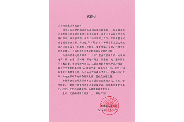 12月18日,苏商建设第二十一集团收到来自广西柳州市鹿寨县政府的感谢信,及县住建局关于柳州市第三届文化旅游大会相关项目建设先进单位的表扬牌匾,对集团在鹿寨项目建设中的出色表现和突出成绩给予肯定并深表感谢。